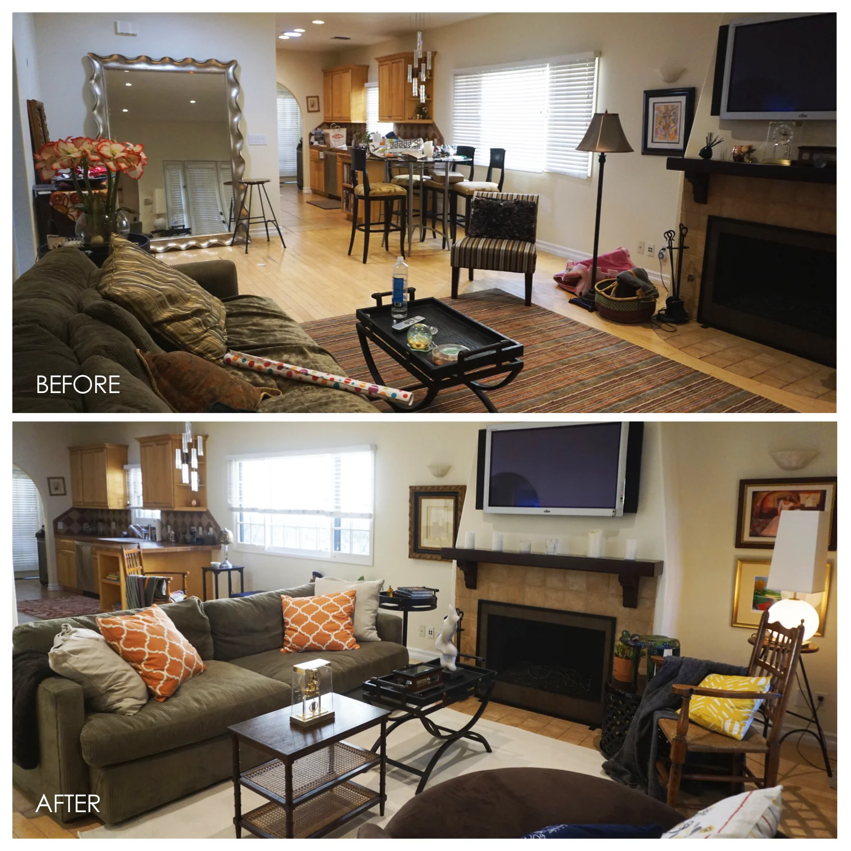 This client had a living room layout that wasn't incredibly interesting and really did not reflect her personal style. I found an interesting antique chair and side table in the bedroom, some artwork and a pedestal stool in the office, and a bar chair in the kitchen.
